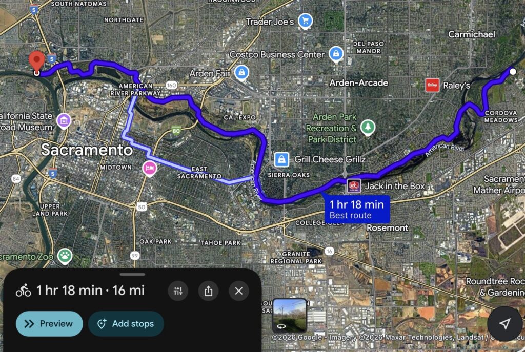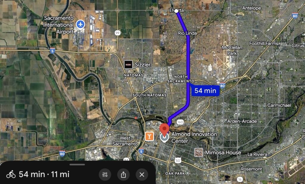 Sacramento Northern Bikeway (South/North) is the bike path that originates in Midtown Sacramento, crosses the American River, and extends all the way to Elverta California, with the paved path terminating at “Elverta Park & Ride”, spanning 10 miles for the fully paved path! I didn’t fully explore this bike path though—after crossing the bridge, there was an option to turn onto another bike trail, the American River Bike Trail, which runs along the length of the River (East/West) although you can’t actually see the River as the path is lined by trees). If you are adventurous, there are a plethora of unpaved Bike Trails in the immediate area, including a path that goes directly to the river. Google Maps recognizes these paths if you select the bicycle navigation option, should you decide to utilize the “bike highway”.